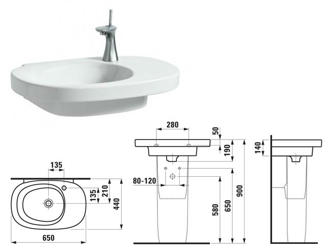 Раковина Laufen Mimo 650 х 440 (мм) комплектуется на выбор полупьедесталом или пьедесталом.