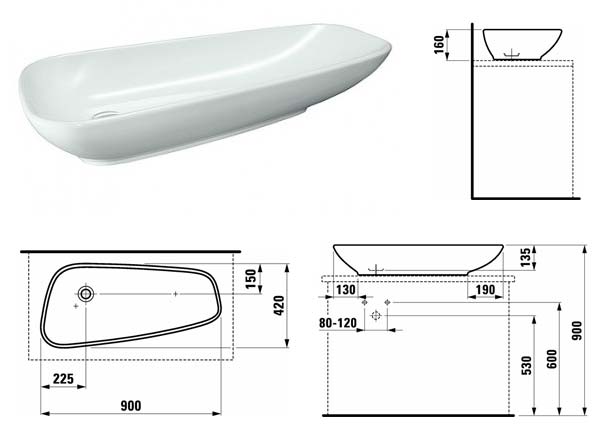 Раковина Laufen Palomba, чаша, накладная 920 х 420 (мм) без отверстия для перелива, без отверстия под смеситель